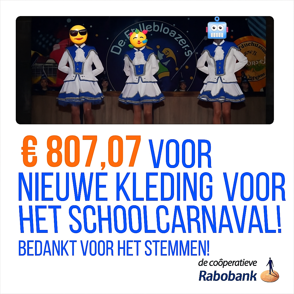 Dit jaar is er maar liefst €807,07 opgehaald met de Rabo Clubsupport van de Rabobank. Wij willen iedereen die gestemd heeft daarvoor enorm bedanken! Met deze bijdrage kunnen wij het schoolcarnaval blij maken met gloednieuwe, gave outfits (de oude kleding is bijna 44 (!) jaar oud).